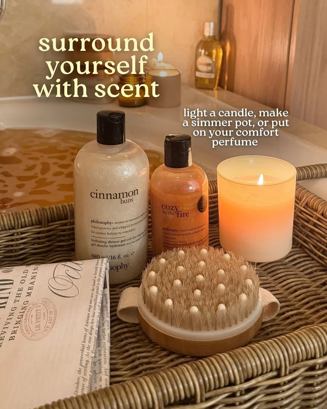 Scent is such a fast way to shift your state. Light your favorite candle, put on your favorite perfume, or simmer something cinnamon-y on the stove.