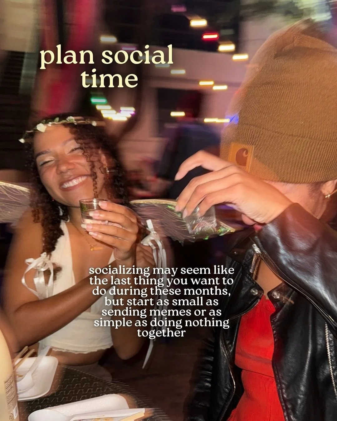 It doesn’t have to be a full dinner or even leaving the house. Just texting someone a meme, planning a facetime, or watching a show with someone on the phone can count.