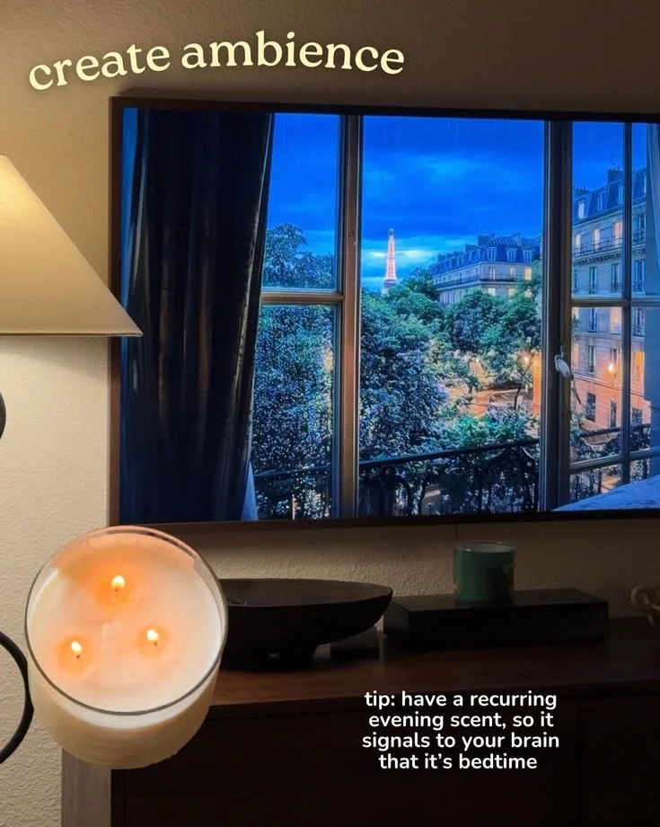 I like to use a recurring evening scent that I use specifically for that time of day and put on some relaxing music to fill the space.