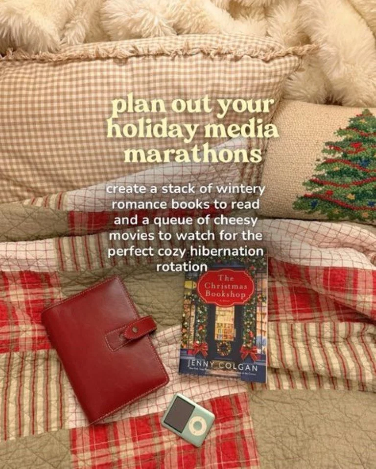 Build yourself the ultimate cozy watchlist. Think holiday rom-coms like The Holiday, old favorites, and a few new cheesy finds.