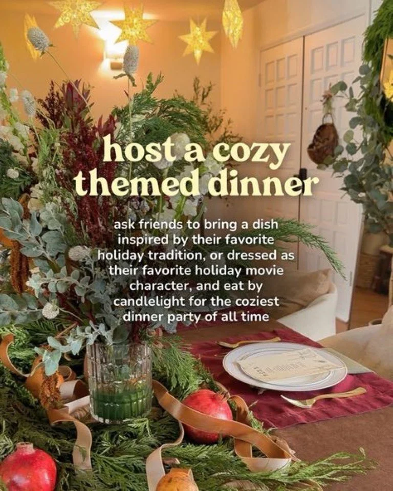 Invite your friends over and make it feel like a scene out of a holiday novel. Ask everyone to bring a dish based on their favorite tradition or wear something inspired by a holiday movie.